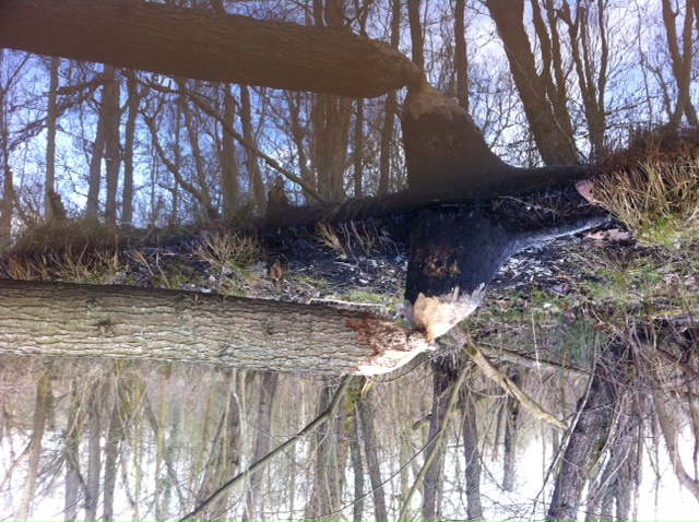 Een bever doorgeknaagd is en nu als brug over een sloot dienst doet.